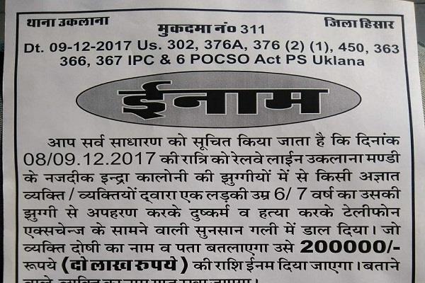 ਹਿਸਾਰ ਦੇ ਉਕਲਾਨਾ ਥਾਣੇ 'ਚ ਦਰਜ ਮੁਕੱਦਮਾ ਨੰਬਰ. 311 'ਚ ਅਣਪਛਾਤੇ ਦੋਸ਼ੀ ਦੇ ਖਿਲਾਫ ਆਈ.ਪੀ.ਸੀ. ਦੀ ਧਾਰਾ 302, 376 ਏ, 376(2)(1) ਅਤੇ 450, 363, 366, 367 ਅਤੇ ਪੋਸਕੋ ਐਕਟ ਦੇ ਤਹਿਤ ਮਾਮਲਾ ਦਰਜ ਕੀਤਾ ਹੈ। ਇਸ ਮਾਮਲੇ 'ਚ 28 ਘੰਟੇ ਬੀਤ ਜਾਣ ਤੋਂ ਬਾਅਦ ਵੀ ਪੁਲਿਸ ਦੋਸ਼ੀ ਦਾ ਪਤਾ ਨਹੀਂ ਲਗਾ ਸਕੀ। ਹੁਣ ਪੁਲਿਸ ਨੇ ਇਸ ਅਣਪਛਾਤੇ ਦੋਸ਼ੀ ਦੇ ਉੱਪਰ ਦੋ ਲੱਖ ਦਾ ਇਨਾਮ ਰੱਖਿਆ ਹੈ। ਪੁਲਿਸ ਨੇ ਇਸ ਘੋਸ਼ਣਾ ਦੇ ਪਰਚੇ ਛਪਵਾ ਕੇ ਲੋਕਾਂ ਵਿਚ ਵੰਡੇ ਹਨ।