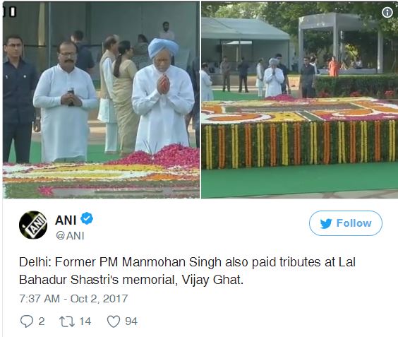 ਮਨਮੋਹਨ ਸਿੰਘ ਨੇ ਸਾਬਕਾ ਪੀਐਮ ਲਾਲ ਬਹਾਦੁਰ ਸ਼ਾਸਤਰੀ ਦੀ ਸਮਾਧੀ ਉੱਤੇ ਜਾਕੇ ਸ਼ਰਧਾਂਜਲੀ ਦਿੱਤੀ।