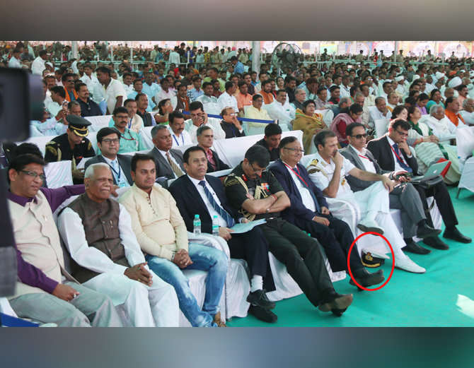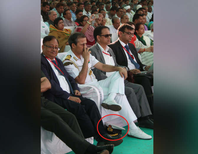 - ਰਾਸ਼ਟਰੀ ਚਿੰਨ੍ਹ ਨਾਲ ਉਪਲਬਧ ਕੈਂਪ ਜੁੱਤੀਆਂ ਦੇ ਕੋਲ ਰੱਖਕੇ ਬੈਠੇ ਰਹੇ। ਉਨ੍ਹਾਂ ਦੀ ਇਹ ਮੁਦਰਾ ਚਰਚਾ ਦਾ ਵਿਸ਼ਾ ਰਹੀ।