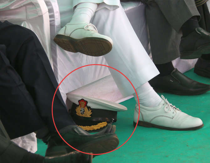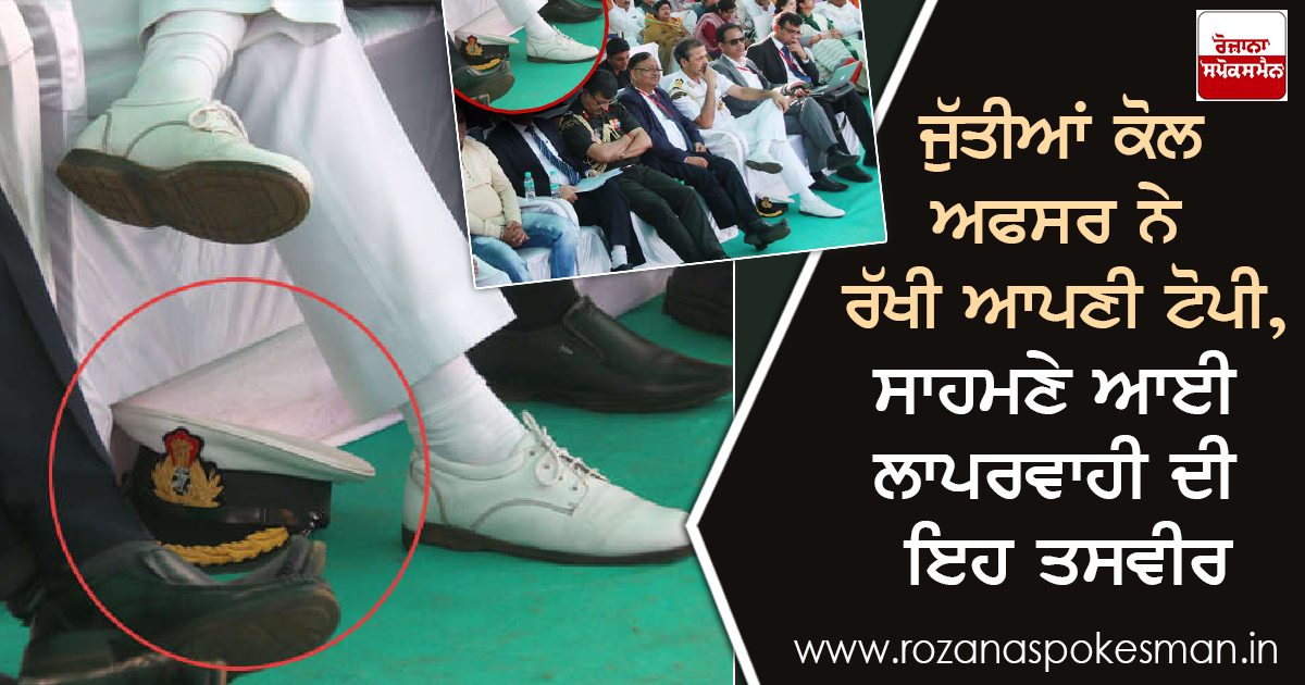 ਪੈਰਾਂ 'ਚ ਜੁੱਤੀਆਂ ਕੋਲ ਰੱਖ ਦਿੱਤੀ ਰਾਸ਼ਟਰੀ ਚਿੰਨ੍ਹ ਵਾਲੀ ਕੈਪ