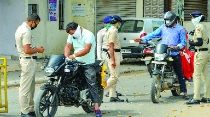ਚੰਡੀਗੜ੍ਹ 'ਚ ਕਰਫ਼ੀਊ ਦੌਰਾਨ ਬਾਹਰ ਨਿਕਲਣ ਵਾਲਿਆਂ ਦੇ ਪਾਸ ਦੀ ਜਾਂਚ ਕਰਦੇ ਪੁਲਿਸ ਮੁਲਾਜ਼ਮ। ਪੀਟੀਆਈ