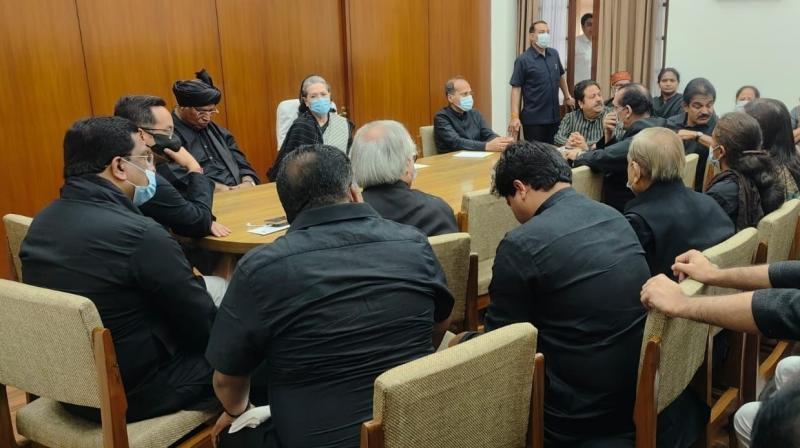 ਕਾਂਗਰਸ ਅਤੇ ਕੁਝ ਹੋਰ ਸਹਿਯੋਗੀ ਪਾਰਟੀਆਂ ਦੇ ਸੰਸਦ ਮੈਂਬਰਾਂ ਨੇ ਰੋਸ ਵਜੋਂ ਕਾਲੇ ਕੱਪੜੇ ਪਹਿਨੇ ਹੋਏ ਸਨ। ਸੰਸਦ ਭਵਨ ਕੰਪਲੈਕਸ 'ਚ ਮਹਾਤਮਾ ਗਾਂਧੀ ਦੀ ਮੂਰਤੀ ਅੱਗੇ ਦਿੱਤੇ ਗਏ ਇਸ ਧਰਨੇ 'ਚ ਕਾਂਗਰਸ ਸੰਸਦੀ ਦਲ ਦੀ ਮੁਖੀ ਸੋਨੀਆ ਗਾਂਧੀ, ਪਾਰਟੀ ਪ੍ਰਧਾਨ ਮਲਿਕਾਰਜੁਨ ਖੜਗੇ, ਕਾਂਗਰਸ ਦੇ ਕਈ ਸੰਸਦ ਮੈਂਬਰਾਂ, ਦ੍ਰਵਿੜ ਮੁਨੇਤਰ ਕੜਗਮ (ਡੀ.ਐੱਮ.ਕੇ.) ਦੇ ਕੇ.ਟੀ.ਆਰ. ਬਾਲੂ, ਰੈਵੋਲਿਊਸ਼ਨਰੀ ਸੋਸ਼ਲਿਸਟ ਪਾਰਟੀ (ਆਰ.ਐੱਸ.ਪੀ.) ਦੇ ਕੇ.ਐੱਨ.ਕੇ. ਅਤੇ ਕੁਝ ਹੋਰ ਆਗੂ ਹਾਜ਼ਰ ਸਨ।