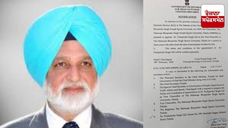 ਚੰਡੀਗੜ੍ਹ : ਪੰਜਾਬ ਸਰਕਾਰ ਨੇ ਡਾ. ਪੁਸ਼ਪਿੰਦਰ ਸਿੰਘ ਗਿੱਲ ਨੂੰ ਮਹਾਰਾਜਾ ਭੁਪਿੰਦਰ ਸਿੰਘ ਸਪੋਰਟਸ ਯੂਨੀਵਰਸਿਟੀ ਪਟਿਆਲਾ ਦਾ ਵਾਈਸ-ਚਾਂਸਲਰ ਨਿਯੁਕਤ ਕੀਤਾ ਹੈ। ਜਾਰੀ ਨੋਟੀਫਿਕੇਸ਼ਨ ਅਨੁਸਾਰ ਪੰਜਾਬ ਦੇ ਰਾਜਪਾਲ ਨੇ ਰਾਜਪਾਲ ਸਕੱਤਰੇਤ ਲੋਕ ਭਵਨ ਪੰਜਾਬ, ਚੰਡੀਗੜ੍ਹ ਰਾਹੀਂ ਡਾ. ਪੁਸ਼ਪਿੰਦਰ ਸਿੰਘ ਗਿੱਲ ਨੂੰ ਮਹਾਰਾਜਾ ਭੁਪਿੰਦਰ ਸਿੰਘ ਪੰਜਾਬ ਸਪੋਰਟਸ ਯੂਨੀਵਰਸਿਟੀ ਪਟਿਆਲਾ ਦੇ ਵਾਈਸ-ਚਾਂਸਲਰ ਵਜੋਂ ਨਿਯੁਕਤ ਕਰਨ ਦਾ ਐਲਾਨ ਕੀਤਾ ਹੈ।ਉਨ੍ਹਾਂ ਦਾ ਕਾਰਜਕਾਲ ਅਹੁਦਾ ਸੰਭਾਲਣ ਦੀ ਮਿਤੀ ਤੋਂ ਤਿੰਨ ਸਾਲਾਂ ਦੇ ਕਾਰਜਕਾਲ ਲਈ ਲਾਗੂ ਹੋਵੇਗਾ।