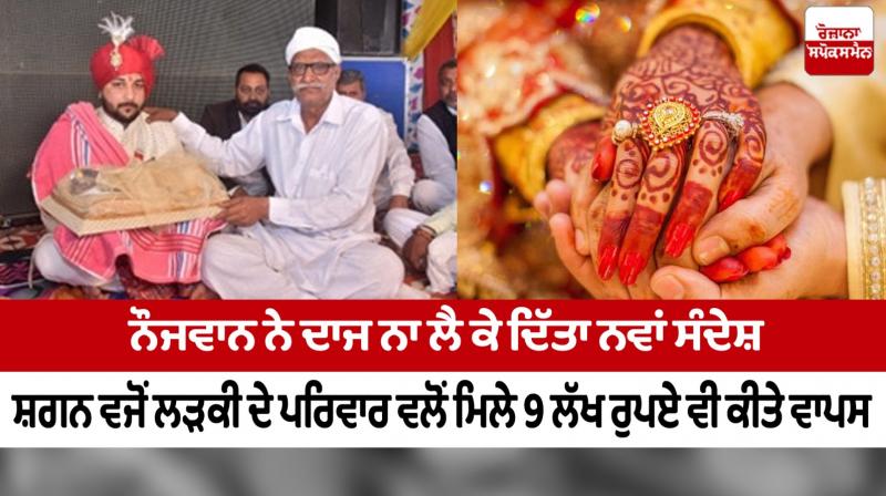 ਲਾਲੜੂ: ਇੱਥੋਂ ਦੇ ਨੇੜਲੇ ਪਿੰਡ ਬੱਸੀ ਦੇ ਨੌਜਵਾਨ ਨੇ ਦਾਜ ਨਾ ਲੈ ਕੇ ਸਮਾਜ ਨੂੰ ਨਵਾਂ ਸੰਦੇਸ਼ ਦਿੱਤਾ ਹੈ। ਕੁਲਜੀਤ ਸਿੰਘ ਰਾਣਾ ਨੇ ਵਿਆਹ ਮੌਕੇ ਲੜਕੀ ਦੇ ਪਰਿਵਾਰ ਵਲੋਂ ਸ਼ਗਨ ਵਜੋਂ ਮਿਲੀ 9 ਲੱਖ ਰੁਪਏ ਦੀ ਰਕਮ ਵੀ ਵਾਪਸ ਕਰ ਦਿੱਤੀ। ਲੜਕੇ ਦੇ ਪਰਿਵਾਰ ਨੇ ਇਸ ਰਕਮ ਨੂੰ ਦਾਜ ਮੰਨ ਕੇ ਵਾਪਸ ਕਰ ਦਿੱਤਾ ਅਤੇ ਇਕ ਵੀ ਰੁਪਇਆ ਨਹੀਂ ਲਿਆ। ਇਹ ਵਿਆਹ ਕਾਫੀ ਚਰਚਾ ਵਿਚ ਹੈ।