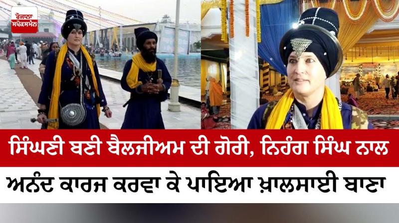 ਸੁਲਤਾਨਪੁਰ ਲੋਧੀ : ਅੱਜ ਸੁਲਤਾਨਪੁਰ ਲੋਧੀ ਵਿਖੇ ਇਕ ਵੱਖਰੀਆਂ ਹੀ ਤਸਵੀਰਾਂ ਦੇਖਣ ਨੂੰ ਮਿਲੀਆਂ ਕਿਉਂਕਿ ਇੱਥੇ ਇਕ ਬੈਲਜੀਅਮ ਤੋਂ ਆਈ ਗੋਰੀ ਖਾਲਸਾਈ ਬਾਣਾ ਪਾ ਕੇ ਪਹੁੰਚੀ ਜੋ ਸੰਗਤਾਂ ਵਿਚ ਖਿੱਚ ਦਾ ਕੇਂਦਰ ਬਣੀ। ਦਰਅਸਲ ਪੰਜਾਬ ਦੇ ਨਿਹੰਗ ਜੈਲ ਸਿੰਘ ਨਾਲ ਇਸ ਗੋਰੀ ਨੇ ਵਿਆਹ ਕਰਵਾਇਆ ਹੈ। ਸਿੰਘਣੀ ਦੇ ਰੂਪ 'ਚ ਸਜੀ ਇਹ ਕੁੜੀ ਬੈਲਜੀਅਮ ਤੋਂ ਆਈ ਹੈ, ਜਿਸ ਨੇ ਪੂਰੇ ਗੁਰਮਰਿਆਦਾ ਨਾਲ ਨਿਹੰਗ ਸਿੰਘ ਨਾਲ ਵਿਆਹ ਕਰਵਾਇਆ ਅਤੇ ਅੱਜ ਸੁਲਤਾਨਪੁਰ ਲੋਧੀ ਦੇ ਗੁਰਦੁਆਰਾ ਸਾਹਿਬ ਵਿਖੇ ਮੱਥਾ ਵੀ ਟੇਕਿਆ। ਇਸ ਸਬੰਧੀ ਜਾਣਕਾਰੀ ਦਿੰਦਿਆਂ ਨਿਹੰਗ ਜੈਲ ਸਿੰਘ ਨੇ ਦੱਸਿਆ ਕਿ ਬੈਲਜ਼ੀਅਮ ਦੀ ਇਸ ਗੋਰੀ ਨਾਲ ਉਸ ਦੀ ਦੋਸਤੀ ਫੇਸਬੁੱਕ ਜਰੀਏ ਹੋਈ ਸੀ।