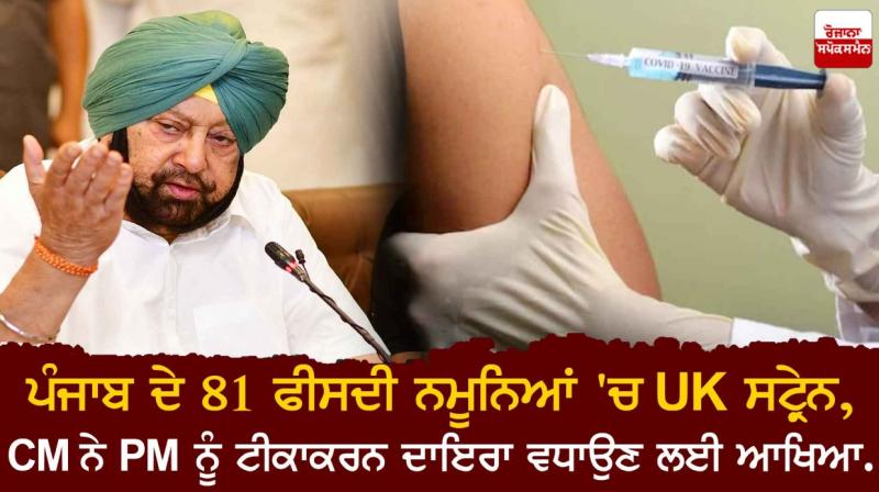 ਚੰਡੀਗੜ: ਸੂਬੇ ਵੱਲੋਂ ਕਰੋਨਾ ਵਾਇਰਸ ਦੇ ਸਰੂਪ ਦੇ ਪੱਧਰ ਪਤਾ ਕਰਨ ਲਈ ਭੇਜੇ ਗਏ 401 ਨਮੂਨਿਆਂ ਵਿੱਚੋਂ 81 ਫੀਸਦੀ ਵਿੱਚ ਯੂ.ਕੇ. ਦੇ ਕੋਵਿਡ ਦੀ ਕਿਸਮ ਪਾਏ ਜਾਣ ਦੇ ਮੱਦੇਨਜ਼ਰ ਪੰਜਾਬ ਦੇ ਮੁੱਖ ਮੰਤਰੀ ਕੈਪਟਨ ਅਮਰਿੰਦਰ ਸਿੰਘ ਨੇ ਮੰਗਲਵਾਰ ਨੂੰ ਲੋਕਾਂ ਨੂੰ ਕੋਵਿਡ ਦਾ ਟੀਕਾ ਲਗਵਾਉਣ ਦੀ ਅਪੀਲ ਕੀਤੀ ਅਤੇ ਪ੍ਰਧਾਨ ਮੰਤਰੀ ਨਰਿੰਦਰ ਮੋਦੀ ਨੂੰ ਟੀਕਾਕਰਨ ਦਾ ਦਾਇਰਾ ਵਧਾ ਕੇ ਇਸ ਵਿੱਚ 60 ਵਰੇ ਤੋਂ ਘੱਟ ਉਮਰ ਦੇ ਲੋਕਾਂ ਨੂੰ ਸ਼ਾਮਿਲ ਕਰਨ ਲਈ ਅਖਿਆ ਕਿਉਂਜੋ ਇਹ ਵਾਇਰਸ ਨੌਜਵਾਨ ਲੋਕਾਂ ਨੂੰ ਵਧੇਰੇ ਪ੍ਰਭਾਵਿਤ ਕਰਦਾ ਪਾਇਆ ਗਿਆ ਹੈ।