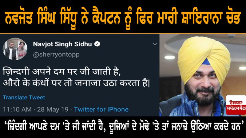 ਸਿੱਧੂ ਨੇ ਆਪਣੇ ਟਵਿਟਰ ਪੇਜ਼ 'ਤੇ ਅੱਜ ਫਿਰ ਇਕ ਨਵੀਂ ਸ਼ਾਇਰੀ ਟਵੀਟ ਕੀਤੀ। ਟਵੀਟ 'ਚ ਲਿਖਿਆ ਹੈ - "ਜ਼ਿੰਦਗੀ ਆਪਣੇ ਦਮ 'ਤੇ ਜੀ ਜਾਂਦੀ ਹੈ, ਦੂਜਿਆਂ ਦੇ ਮੋਢੇ 'ਤੇ ਤਾਂ ਜਨਾਜ਼ੇ ਉੱਠਿਆ ਕਰਦੇ ਹਨ।" ਇਸ ਟਵੀਟ ਤੋਂ ਇਹੀ ਲੱਗਦਾ ਹੈ ਕਿ ਸਿੱਧੂ ਕਿਸੇ ਦੇ ਦਬਾਅ 'ਚ ਆ ਕੇ ਕੰਮ ਨਹੀਂ ਕਰਦੇ। ਉਹ ਆਪਣੀ ਮਰਜ਼ੀ ਮੁਤਾਬਕ ਫ਼ੈਸਲੇ ਲੈਂਦੇ ਹਨ।