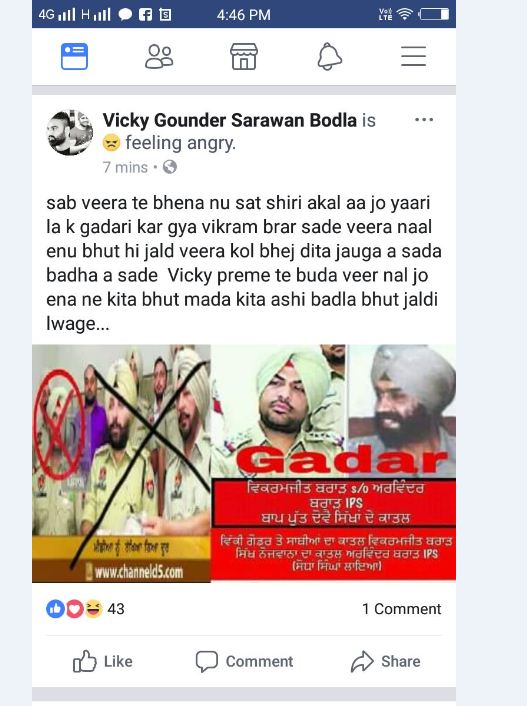 ਫੇਸਬੁੱਕ 'ਤੇ ਪਾਈ ਗਈ ਪੋਸਟ ਵਿਚ ਲਿਖਿਆ ਗਿਆ ਹੈ ਕਿ 'ਯਾਰੀ ਲਾ ਕੇ ਗੱਦਾਰੀ ਕਰਨ ਵਾਲੇ ਬਿਕਰਮ ਬਰਾੜ ਨੂੰ ਬਹੁਤ ਜਲਦ ਵੀਰਾਂ ਕੋਲ ਭੇਜ ਦਿੱਤਾ ਜਾਵੇਗਾ, ਜੋ ਇਹਨੇ ਕੀਤਾ ਬਹੁਤ ਮਾੜਾ ਕੀਤਾ। ਅਸੀਂ ਬਹੁਤ ਜਲਦੀ ਬਦਲਾ ਲਵਾਂਗੇ। ਸੋਸ਼ਲ ਮੀਡੀਆ 'ਤੇ ਦਿੱਤੀ ਇਸ ਧਮਕੀ ਵਿਚ ਵਿਕਰਮ ਬਰਾੜ ਅਤੇ ਉਸ ਦੇ ਪਿਤਾ ਰਵਿੰਦਰ ਬਰਾੜ ਦੀ ਤਸਵੀਰ ਨੂੰ ਗੱਦਾਰ ਲਿਖ ਕੇ ਸ਼ੇਅਰ ਕੀਤਾ ਗਿਆ ਹੈ ਅਤੇ ਦੋਵਾਂ ਨੂੰ ਸਿੱਖ ਮੁੰਡਿਆਂ ਦਾ ਕਾਤਲ ਦੱਸਿਆ ਗਿਆ ਹੈ।