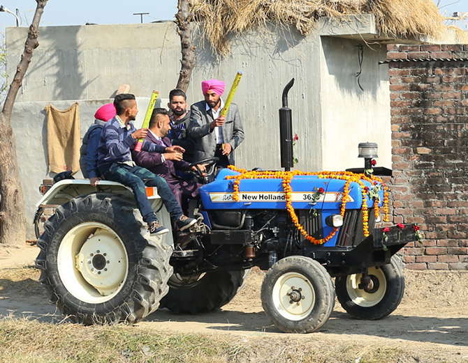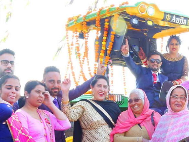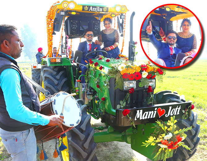 - ਨਵਵਿਆਹਿਆਂ ਜੋੜਾ ਮੰਗਲਵਾਰ ਨੂੰ ਵਿਆਹ ਦੀ ਪਾਰਟੀ ਵਿਚ ਪਿੰਡ ਪੱਟੀ ਤੋਂ ਹੁਸ਼ਿਆਰਪੁਰ ਦੇ ਪੈਲੇਸ ਵਿਚ ਟਰੈਕਟਰ 'ਤੇ ਪਹੁੰਚਿਆ।
