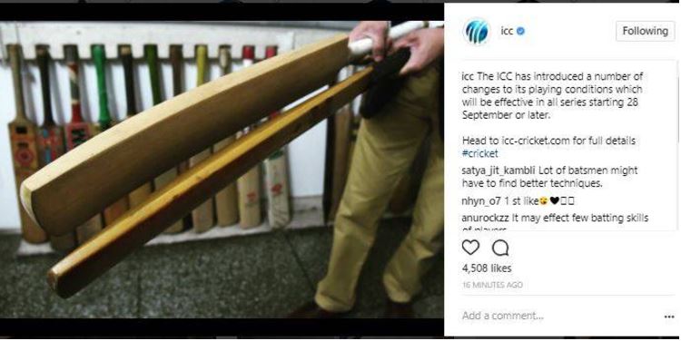 ਬੱਲੇ ਅਤੇ ਗੇਂਦ ਵਿੱਚ ਸੰਤੁਲਨ ਬਣਾਏ ਰੱਖਣ ਲਈ ਬੱਲੇ ਦੇ ਕਿਨਾਰਿਆਂ ਦਾ ਸਰੂਪ ਅਤੇ ਉਸਦੀ ਮੋਟਾਈ ਹੁਣ ਸੀਮਿਤ ਹੋ ਜਾਵੇਗੀ, ਆਈਸੀਸੀ ਨੇ ਕਿਹਾ, ਬੱਲੇ ਦੀ ਲੰਮਾਈ ਅਤੇ ਚੋੜਾਈ ਉੱਤੇ ਰੋਕ ਬਰਕਰਾਰ ਰਹੇਗੀ, ਲੇਕਿਨ ਕੰਡੇ ਦੀ ਮੋਟਾਈ ਹੁਣ 40 ਮਿਮੀ ਤੋਂ ਜ਼ਿਆਦਾ ਨਹੀਂ ਹੋ ਸਕਦੀ ਅਤੇ ਇਸਦੀ ਕੰਡੇ ਦੀ ਪੂਰੀ ਗਹਿਰਾਈ ਅਧਿਕਤਮ 67 ਮਿਮੀ ਹੀ ਹੋ ਸਕਦੀ ਹੈ। ਅੰਪਾਇਰਾਂ ਨੂੰ ਨਵਾਂ ਬੈਟ ਗਾਜ ਦਿੱਤਾ ਜਾਵੇਗਾ, ਜਿਸਦੇ ਨਾਲ ਉਹ ਖਿਡਾਰੀਆਂ ਦੇ ਬੱਲੇ ਦੀ ਜਾਂਚ ਕਰ ਸਕਦੇ ਹਨ।