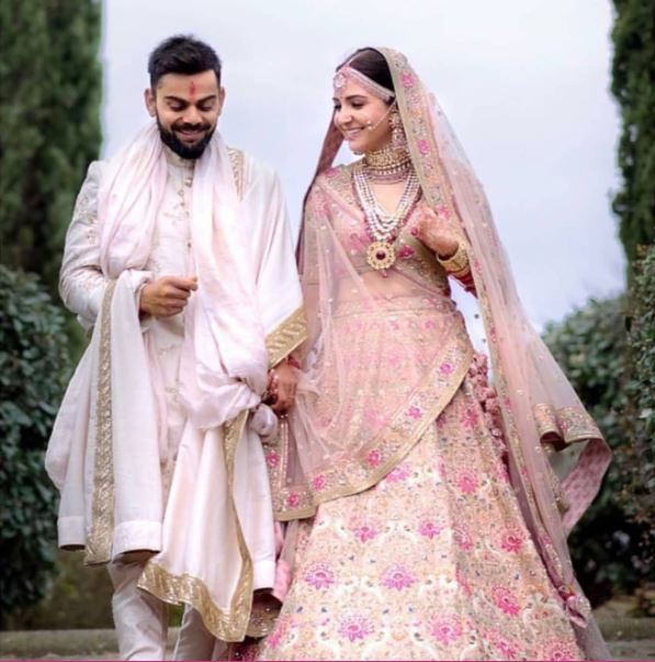 ਫੇਰਿਆਂ ਦੌਰਾਨ ਅਨੁਸ਼ਕਾ ਨੇ ਡਿਜਾਇਨਰ ਸਬਿਆਸਾਚੀ ਦਾ ਲਾਇਟ ਪਿੰਕ ਕਲਰ ਦਾ ਘੱਗਰਾ ਪਾਇਆ ਤਾਂ ਵਿਰਾਟ ਕੋਹਲੀ ਕਰੀਮ ਸ਼ੇਰਵਾਨੀ ਵਿੱਚ ਨਜ਼ਰ ਆਏ।