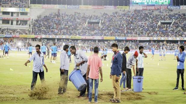 ਰਾਜੀਵ ਗਾਂਧੀ ਅੰਤਰਰਾਸ਼ਟਰੀ ਸਟੇਡਿਅਮ ਵਿੱਚ ਖੇਡ ਵਿੱਚ ਦੇਰੀ ਹੋਣ ਦੇ ਕਾਰਨ ਅੰਪਾਇਰਾਂ ਨੇ ਵਿੱਚ-ਵਿੱਚ ਤਿੰਨ ਵਾਰ ਮੈਦਾਨ ਦੀ ਜਾਂਚ ਕੀਤੀ ਪਰ ਮੈਦਾਨਕਰਮੀਆਂ ਦੀਆਂ ਕੋਸ਼ਿਸ਼ਾਂ ਦੇ ਬਾਵਜੂਦ ਖੇਡ ਸੰਭਵ ਨਾ ਹੋ ਪਾਇਆ।