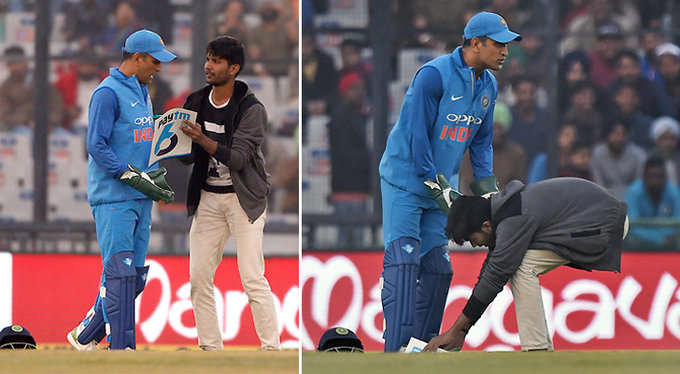 - ਧੋਨੀ ਦੇ ਕੋਲ ਪਹੁੰਚਕੇ ਉਸਨੇ ਇੰਡੀਅਨ ਵਿਕਟਕੀਪਰ ਦੇ ਪੈਰ ਛੂਹ ਲਏ। ਇਸਦੇ ਬਾਅਦ ਧੋਨੀ ਨੇ ਉਸ ਨਾਲ ਹੱਥ ਮਿਲਾਇਆ।