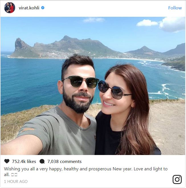 ਵਿਰਾਟ ਕੋਹਲੀ ਦੀ ਕਪਤਾਨੀ ਵਿਚ ਟੀਮ ਇੰਡੀਆ 5 ਜਨਵਰੀ ਤੋਂ ਸਾਉਥ ਅਫਰੀਕਾ ਨਾਲ ਭਿੜੇਗਾ। ਟੀਮ ਇੰਡੀਆ ਸਾਉਥ ਅਫਰੀਕਾ ਪਹੁੰਚ ਚੁੱਕੀ ਹੈ ਅਤੇ ਤਿਆਰੀਆਂ ਵਿਚ ਜੁਟੀ ਹੈ। ਵਿਰਾਟ ਕੋਹਲੀ ਦੇ ਨਾਲ ਅਨੁਸ਼ਕਾ ਸ਼ਰਮਾ ਵੀ ਸਾਉਥ ਅਫਰੀਕਾ ਗਈ ਹੈ ਅਤੇ ਦੋਨਾਂ ਨੇ ਨਾਲ ਨਿਊ ਈਅਰ ਇੰਜੁਆਏ ਕੀਤਾ। ਵਿਰਾਟ ਅਤੇ ਅਨੁਸ਼ਕਾ ਨੇ ਸੋਸ਼ਲ ਮੀਡੀਆ 'ਤੇ ਇਹ ਫੋਟੋ ਅਪਲੋਡ ਕੀਤੀ ਹੈ ਅਤੇ ਲਿਖਿਆ ਹੈ - ਤੁਹਾਨੂੰ ਸਾਰਿਆਂ ਨੂੰ ਨਵੇਂ ਸਾਲ ਦੀ ਹਾਰਦਿਕ ਸ਼ੁਭਕਾਮਨਾਵਾਂ। ਦੋਨਾਂ ਨੇ ਇਕ ਹੀ ਫੋਟੋ ਅਪਲੋਡ ਕੀਤੀ ਹੈ ਅਤੇ ਇਕ ਹੀ ਕੈਪਸ਼ਨ ਲਿਖਿਆ ਹੈ। ਇਹੀ ਨਹੀਂ ਉਨ੍ਹਾਂ ਨੇ ਵਿਆਹ ਦੇ ਬਾਅਦ ਵੀ ਇਕੋ ਫੋਟੋ ਅਪਲੋਡ ਕੀਤੀ ਸੀ ਅਤੇ ਲੋਕਾਂ ਨੂੰ ਸੂਚਨਾ ਦਿੱਤੀ ਸੀ।