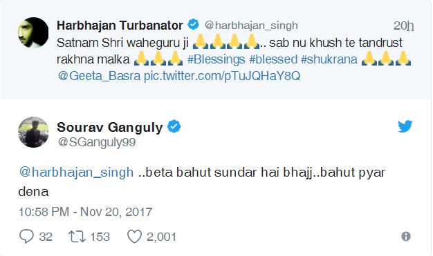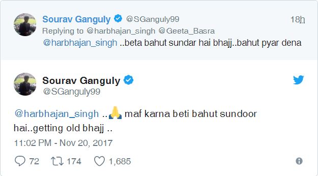 ਇਸਦੇ ਬਾਅਦ ਭੱਜੀ ਨੇ ਵੀ ਦਾਦਾ ਨੂੰ ਮੈਸੇਜ ਕੀਤਾ ਅਤੇ ਲਿਖਿਆ, ਤੁਹਾਡੀ ਸ਼ੁੱਭ ਕਾਮਨਾਵਾਂ ਲਈ ਧੰਨਵਾਦ ਦਾਦਾ, ਆਸ ਕਰਦੇ ਹਾਂ ਤੁਸੀਂ ਦੋਨਾਂ ਦੀ ਬਹੁਤ ਛੇਤੀ ਮੁਲਾਕਾਤ ਹੋਵੇਗੀ