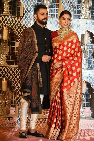 ਦਿੱਲੀ ਦੇ ਤਾਜ ਹੋਟਲ ਵਿੱਚ ਹੋਈ ਗਰੈਂਡ ਪਾਰਟੀ ਵਿੱਚ ਅਨੁਸ਼ਕਾ ਸ਼ਰਮਾ ਅਤੇ ਵਿਰਾਟ ਕੋਹਲੀ ਨੇ ਜੱਮਕੇ ਕੈਮਰੇ ਦਾ ਫੋਕਸ ਖਿੱਚਿਆ। ਵਿਰਾਟ ਜਿੱਥੇ ਸੋਨੇ ਦੇ ਬਟਨ ਵਾਲੀ ਬੰਦ ਗਲਾ ਸ਼ੇਰਵਾਨੀ ਵਿੱਚ ਨਜ਼ਰ ਆਏ ਤਾਂ ਅਨੁਸ਼ਕਾ ਨੇ ਲਾਲ ਰੰਗ ਦੀ ਬਨਾਰਸੀ ਸਾੜ੍ਹੀ ਪਹਿਨੀ ਸੀ। ਦੋਨਾਂ ਦੇ ਕੱਪੜੇ ਫ਼ੈਸ਼ਨ ਡਿਜਾਇਨਰ ਸਬਿਅਸਾਚੀ ਮੁਖਰਜੀ ਨੇ ਡਿਜਾਇਨ ਕੀਤਾ ਸੀ।