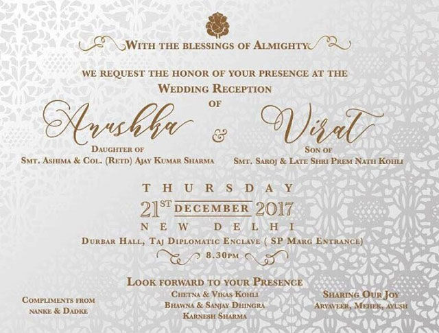 ਵਿਆਹ ਬੰਧਨ 'ਚ ਬੱਝੇ ਵਿਰਾਟ ਤੇ ਅਨੁਸ਼ਕਾ ਵਲੋਂ 21 ਦਸੰਬਰ ਨੂੰ ਨਵੀਂ ਦਿੱਲੀ ਵਿਖੇ, ਜਦਕਿ 26 ਦਸੰਬਰ ਨੂੰ ਮੁੰਬਈ ਵਿਖੇ ਰਿਸੈਪਸ਼ਨ ਪਾਰਟੀ ਰੱਖੀ ਗਈ ਹੈ। ਰਿਸੈਪਸ਼ਨ ਤੋਂ ਬਾਅਦ ਨਵ ਵਿਆਹੀ ਜੋੜੀ ਦੱਖਣੀ ਅਫਰੀਕਾ ਜਾਵੇਗੀ, ਜਿੱਥੇ ਵਿਰਾਟ ਕੋਹਲੀ ਕ੍ਰਿਕਟ ਖੇਡਣ ਜਾਣਗੇ।
