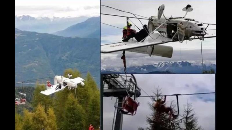 ਰੋਮ : ਇਟਲੀ ਦੇ ਲੋਮਬਾਰਡੀ ਸੂਬੇ 'ਚ ਦਿਲ ਦਹਿਲਾ ਦੇਣ ਵਾਲਾ ਜਹਾਜ਼ ਹਾਦਸਾ ਵਾਪਰਿਆ ਹੈ। ਇੱਥੇ ਇੱਕ ਛੋਟੇ ਜਹਾਜ 'ਤੇ ਸਵਾਰ ਪਾਇਲਟ ਅਤੇ ਇਕ ਯਾਤਰੀ ਦੀ ਜਾਨ ਉਸ ਸਮੇਂ ਖਤਰੇ 'ਚ ਪੈ ਗਈ ਜਦੋਂ 150 ਫੁੱਟ ਦੀ ਉਚਾਈ 'ਤੇ ਜਹਾਜ਼ ਤਾਰਾਂ 'ਚ ਉਲਝ ਗਿਆ। ਇਸ ਮਗਰੋਂ ਜਹਾਜ਼ ਹਵਾ 'ਚ ਲਟਕ ਗਿਆ। ਚੰਗੀ ਕਿਸਮਤ ਨਾਲ ਕੋਈ ਅਣਹੋਣੀ ਨਹੀਂ ਵਾਪਰੀ ਅਤੇ ਪਾਇਲਟ ਸਮੇਤ ਯਾਤਰੀ ਨੂੰ ਸੁਰੱਖਿਅਤ ਬਚਾ ਲਿਆ ਗਿਆ। ਅਸਲ 'ਚ ਇਕ ਛੋਟਾ ਜਹਾਜ਼ ਇਟਲੀ ਦੇ ਆਲਪਸ ਪਰਬਤ ਦੇ ਨੇੜਿਓਂ ਲੰਘ ਰਿਹਾ ਸੀ।