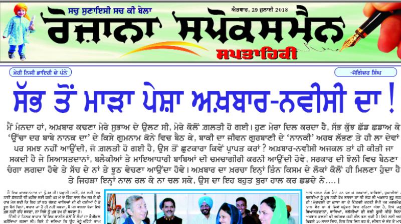 ਐਤਵਾਰ 29 ਜੁਲਾਈ ਦੇ 'ਰੋਜ਼ਾਨਾ ਸਪੋਕਸਮੈਨ' ਦੇ ਮੁੱਖ ਪੰਨੇ ਉਤੇ ਉਪਰੋਕਤ ਲੇਖ ਪੜ੍ਹਿਆ। ਇਹ ਲੇਖ ਸਰਦਾਰ ਜੋਗਿੰਦਰ ਸਿੰਘ ਹੋਰਾਂ ਦੀ ਨਿਜੀ ਡਾਇਰੀ ਦੇ ਪੰਨੇ ਤੇ ਛਪਿਆ ਸੀ। ਇਸ ਵਿਚ ਸ. ਜੋਗਿੰਦਰ ਸਿੰਘ ਹੋਰਾਂ ਨੇ ਅਪਣਾ ਦਰਦ ਜ਼ਾਹਰ ਕੀਤਾ, ਜੋ ਉਨ੍ਹਾਂ ਨਾਲ ਅਤੇ ਸਪੋਕਸਮੈਨ ਅਤੇ ਉੱਚਾ ਦਰ ਬਾਬੇ ਨਾਨਕ ਨਾਲ ਬੀਤ ਰਿਹਾ ਹੈ। ਇਹ ਪੱਤਰਕਾਰਤਾ ਮੈਂ ਵੀ ਕਰ ਕੇ ਵੇਖੀ ਹੈ। ਬਾਬਾ ਨਾਨਕ ਦਾ ਕਥਨ ਹੈ ''ਜੇ ਕੋ ਬੋਲੇ ਸਚੁ ਕੂੜਾ ਜਲਿ ਜਾਵਈ।। '' ਇਹ ਸਤਰਾਂ ਗੁਰਬਾਣੀਆਂ ਦੀਆਂ ਤੁਹਾਡੇ ਉਤੇ ਵੀ ਠੀਕ ਬੈਠਦੀਆਂ ਹਨ।