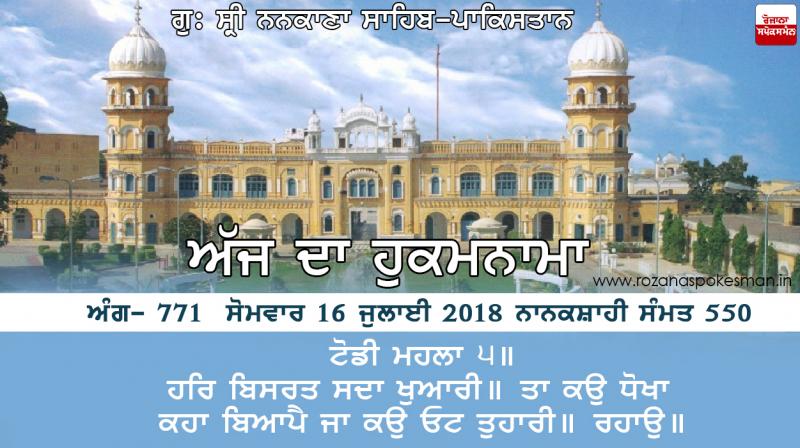 ਅੰਗ- 771 ਸੋਮਵਾਰ 16 ਜੁਲਾਈ 2018 ਨਾਨਕਸ਼ਾਹੀ ਸੰਮਤ 550