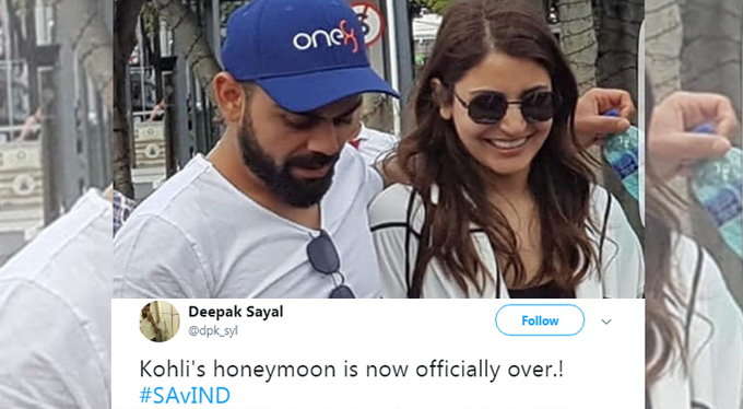 ਫੈਂਸ ਟਵੀਟ ਕੀਤਾ ਕਿ ਵਿਰਾਟ ਨੂੰ ਵਾਇਫ ਦੇ ਨਾਲ ਸ਼ਾਪਿੰਗ ਤੇ ਜਾਣਾ ਹੋਵੇਗਾ, ਇਸ ਲਈ ਉਹ ਜ਼ਲਦੀ ਆਉਟ ਹੋ ਗਏ। ਉਥੇ ਹੀ ਕੁਝ ਲੋਕਾਂ ਨੇ ਅਨੁਸ਼ਕਾ ਨੂੰ ਵਿਰਾਟ ਲਈ ਬੈਡਲਕ ਦੱਸਿਆ।