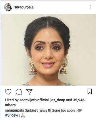 ਜਿਥੇ ਕਈ ਸਿਤਾਰਿਆਂ ਨੇ ਉਹਨਾ ਨੂੰ ਤਸਵੀਰਾਂ ਸਾਂਝੀਆਂ ਕਰਕੇ ਯਾਦ ਕੀਤਾ। ਉਥੇ ਹੀ ਪੰਜਾਬੀ ਸੰਗੀਤ ਜਗਤ ਦੇ ਉਘੇ ਗਾਇਕ ਗੁਰਦਾਸ ਮਾਨ ਨੇ ਵੀ ਆਪਣੇ ਤਰੀਕੇ ਨਾਲ ਬਾਲੀਵੁੱਡ ਦੀ ਚਾਂਦਨੀ ਨੂੰ ਸ਼ਰਧਾਂਜਲੀ ਦਿੰਦਿਆਂ ਇੱਕ ਈਵੈਂਟ ਦੇ ਵਿਚ ਛੱਲਾ ਗੀਤ ਗਾਉਦਿਆਂ ਸ਼ਰਧਾਂਜਲੀ ਦਿੱਤੀ ਅਤੇ ਸ਼੍ਰੀ ਦੇਵੀ ਦੀ ਅਦਾਕਾਰੀ ਅਤੇ ਖੂਬਸੂਰਤੀ ਦੀ ਤਰੀਫ ਕੀਤੀ।