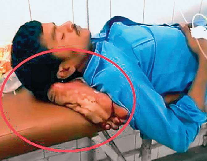 ਝਾਂਸੀ ਦੇ ਮਹਾਰਾਣੀ ਲਕਸ਼ਮੀ ਬਾਈ ਮੈਡੀਕਲ ਕਾਲਜ 'ਚ ਸ਼ਰਮਸਾਰ ਕਰਨ ਵਾਲੀ ਘਟਨਾ ਸਾਹਮਣੇ ਆਈ ਹੈ। ਇਲਜ਼ਾਮ ਹੈ ਕਿ ਡਾਕਟਰਾਂ ਨੇ ਹਾਦਸੇ 'ਚ ਜ਼ਖ਼ਮੀ ਹੋਣ ਤੋਂ ਬਾਅਦ ਹਸਪਤਾਲ 'ਚ ਦਾਖ਼ਲ ਹੋਏ ਕਲੀਨਰ ਦੇ ਕੱਟੇ ਪੈਰ ਨੂੰ ਹੀ ਉਸ ਦੇ ਸਿਰ ਦੇ ਹੇਠਾਂ ਰਖ ਕੇ ਸਿਰਹਾਣਾ ਬਣਾ ਦਿਤਾ।