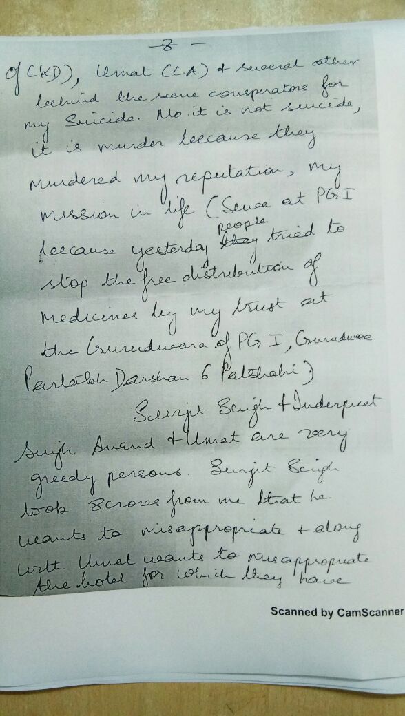 ਇਸ ਦੇ ਨਾਲ ਹੀ ਹਰਜੀਤ ਸਿੰਘ ਚੱਢਾ ਨੇ ਆਪਣੇ ਪਿਤਾ ਦੇ ਗਲਤ ਦਸਤਖਤ ਕਰਕੇ ਜਾਇਦਾਦ 'ਚ ਹੇਰਾ-ਫੇਰੀ ਕੀਤੀ ਸੀ। ਇਸ ਸੁਸਾਈਡ ਨੋਟ 'ਚ ਏ. ਡੀ.ਜੀ. ਪੀ. ਰਾਕੇਸ਼ ਚੰਦਰਾ ਸਣੇ ਸੁਰਜੀਤ, ਇੰਦਰਪ੍ਰੀਤ ਸਿੰਘ, ਹਰੀ ਸਿੰਘ ਸੰਧੂ, ਨਿਰਮਲ ਸਿੰਘ ਅਤੇ ਹੋਰਾਂ ਦੇ ਨਾਂ ਸ਼ਾਮਲ ਹਨ।