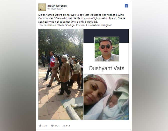 15 ਫਰਵਰੀ ਨੂੰ ਅਸਮ ਦੇ ਮਾਜੁਲੀ ਆਈਸਲੈਂਡ 'ਚ ਇੰਡੀਅਨ ਆਰਮੀ ਦਾ ਹੈਲੀਕਾਪਟਰ ਕਰੈਸ਼ ਹੋ ਗਿਆ ਸੀ। ਇਸ ਹੈਲੀਕਾਪਟਰ 'ਚ ਸਵਾਰ ਦੋਨਾਂ ਪਾਇਲਟਾਂ ਦੀ ਮੌਤ ਹੋ ਗਈ ਸੀ। ਜਿਸ 'ਚ ਵਿੰਗ ਕਮਾਂਡਰ ਜੈਪਾਲ ਜੇਮਜ਼ ਅਤੇ ਵਿੰਗ ਕਮਾਂਡਰ ਦੁਸ਼ਯੰਤ ਵਤਸ ਸ਼ਾਮਿਲ ਹਨ। ਦੁਸ਼ਯੰਤ ਵਤਸ ਮੇਜਰ ਕੁਮੁਦ ਡੋਗਰਾ ਦੇ ਪਤੀ ਸਨ।