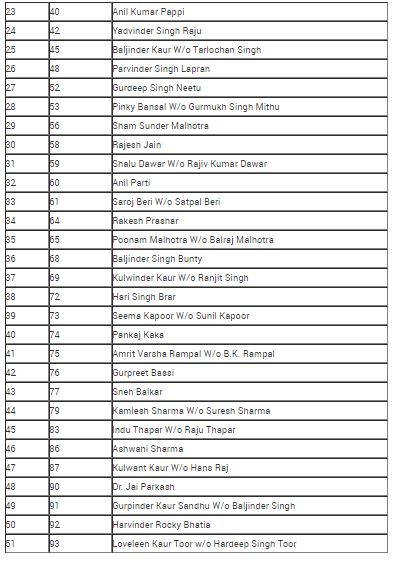 ਇਨ੍ਹਾਂ ਤੋਂ ਇਲਾਵਾ ਵਾਰਡ ਨੰ 56 ਤੋਂ ਸ਼ਾਮ ਸੁੰਦਰ ਮਲਹੋਤਰਾ, 58 ਤੋਂ ਰਾਜੇਸ਼ ਜੈਨ, 59 ਤੋਂ ਸ਼ਾਲੂ ਡਾਵਰ, 60 ਤੋਂ ਅਨਿਲ ਪਰਤੀ, 61 ਤੋਂ ਸਰੋਜ ਬੇਰੀ, 64 ਤੋਂ ਰਾਕੇਸ਼ ਪ੍ਰਾਸ਼ਰ, 65 ਤੋਂ ਪੂਨਮ ਮਲਹੋਤਰਾ, 68 ਤੋਂ ਬਲਜਿੰਦਰ ਸਿੰਘ ਬੰਟੀ, 69 ਤੋਂ ਕੁਲਵਿੰਦਰ ਕੌਰ, 72 ਤੋਂ ਹਰੀ ਸਿੰਘ ਬਰਾੜ, 73 ਤੋਂ ਸੀਮਾ ਕਪੂਰ, 74 ਤੋਂ ਪੰਕਜ ਕਾਕਾ, 75 ਤੋਂ ਅਮ੍ਰਿਤ ਵਰਸ਼ਾ ਰਾਮਪਾਲ, 76 ਤੋਂ ਗੁਰਪ੍ਰੀਤ ਬੱਸੀ, 77 ਤੋਂ ਸਨੇਹ ਬਲਕਾਰ, 79 ਤੋਂ ਕਮਲੇਸ਼ ਸ਼ਰਮਾ, 83 ਤੋਂ ਇੰਦੂ ਥਾਪਰ, 86 ਤੋਂ ਅਸ਼ਵਨੀ ਸ਼ਰਮਾ, 87 ਤੋਂ ਕੁਲਵੰਤ ਕੌਰ, 90 ਤੋਂ ਡਾ. ਜੈ ਪ੍ਰਕਾਸ਼, 91 ਤੋਂ ਗੁਰਪਿੰਦਰ ਕੌਰ ਸੰਧੂ, ਵਾਰਡ ਨੰ.92 ਤੋਂ ਹਰਵਿੰਦਰ ਰੌਕੀ ਭਾਟੀਆ ਤੇ ਵਾਰਡ ਨੰ. 93 ਤੋਂ ਲਵਲੀਨ ਕੌਰ ਤੂਰ ਕਾਂਗਰਸ ਦੇ ਉਮੀਦਵਾਰ ਹੋਣਗੇ।