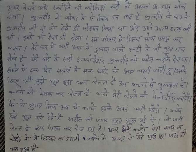 ਵਿਆਹ ਦੇ ਬਾਅਦ 27 ਸਾਲਾਂ ਵਿੱਚ ਉਸਨੇ ਇੱਕ ਵੀ ਦਿਨ ਸੁਖ ਦਾ ਨਹੀਂ ਦੇਖਿਆ। ਉਸਨੇ ਸਿੱਧੇ ਤੌਰ ਉੱਤੇ ਉਸਦਾ ਘਰ ਉਜਾੜਨ ਲਈ ਪਤੀ ਕੁਲਦੀਪ, ਨਨਾਣ ਬਬੀਤਾ, ਨਣਦੋਈਆ ਪੰਮੀ ਅਤੇ ਇੱਕ ਹੋਰ ਸੁਭਾਸ਼ ਨੂੰ ਜ਼ਿੰਮੇਵਾਰ ਠਹਿਰਾਇਆ ਹੈ। ਇੱਕ ਗੁਆਢੀ ਦੁਕਾਨਦਾਰ ਦਾ ਜਿਕਰ ਵੀ ਉਸ ਸੁਸਾਇਡ ਨੋਟ ਵਿੱਚ ਹੋਇਆ ਹੈ।