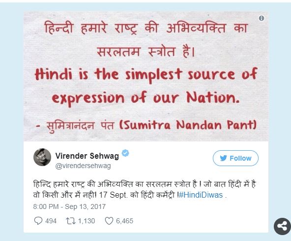 ਪਰ ਇਸ ਵਾਰ ਉਨ੍ਹਾਂ ਤੋਂ ਇਕ ਵੱਡੀ ਗਲਤੀ ਹੋ ਗਈ। ਦਰਅਸਲ, ਵੀਰਵਾਰ (14 ਸਤੰਬਰ) ਨੂੰ ਹਿੰਦੀ ਦਿਸਵ ਦੇ ਮੌਕੇ ਉੱਤੇ ਉਨ੍ਹਾਂ ਨੇ ਟਵੀਟ ਕਰਕੇ ਆਪਣੇ ਫੈਨਸ ਨੂੰ ਵਧਾਈ ਦਿੱਤੀ। ਇਸ ਟਵੀਟ ਵਿਚ ਉਨ੍ਹਾਂ ਤੋਂ ਇੱਕ ਗਲਤੀ ਹੋ ਗਈ। ਸਹਿਵਾਗ ਨੇ ਟਵੀਟ ਕੀਤਾ- ਹਿੰਦੀ ਸਾਡੇ ਰਾਸ਼ਟਰ ਦੀ ਪ੍ਰਕਾਸ਼ਨ ਦਾ ਸਰਲਤਮ ਸਤਰੋਤ ਹੈ! ਜੋ ਗੱਲ ਹਿੰਦੀ ਵਿੱਚ ਹੈ ਉਹ ਕਿਸੇ ਹੋਰ ਵਿਚ ਨਹੀ!