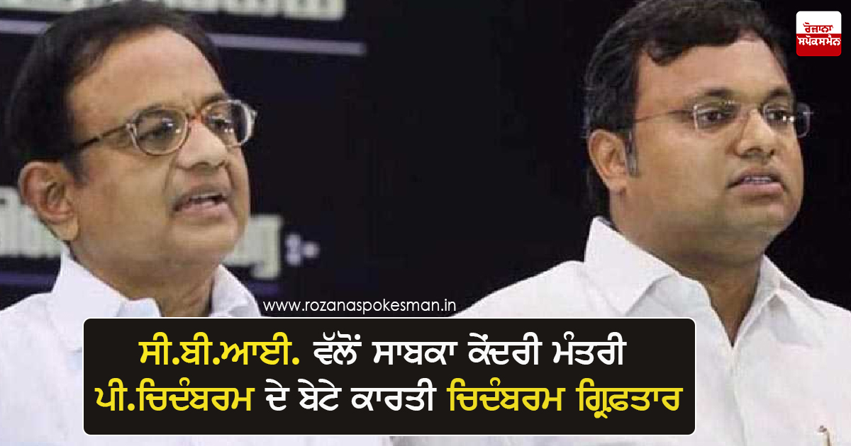 ਨਵੀਂ ਦਿੱਲੀ - ਮੀਡੀਆ ਰਿਪੋਰਟਾਂ ਮੁਤਾਬਿਕ ਸੀ.ਬੀ.ਆਈ. ਵੱਲੋਂ ਸਾਬਕਾ ਕੇਂਦਰੀ ਮੰਤਰੀ ਪੀ.ਚਿਦੰਬਰਮ ਦੇ ਬੇਟੇ ਕਾਰਤੀ ਚਿਦੰਬਰਮ ਨੂੰ ਚੇਨਈ ਵਿਚ ਗ੍ਰਿਫ਼ਤਾਰ ਕੀਤਾ ਗਿਆ ਹੈ। ਕਾਰਤੀ ਨੂੰ ਆਈ.ਐਨ.ਐਕਸ. ਮਾਮਲੇ ਵਿਚ ਗ੍ਰਿਫ਼ਤਾਰ ਕੀਤਾ ਗਿਆ ਹੈ। ਇਸ ਤੋਂ ਪਹਿਲਾ ਸਾਬਕਾ ਕੇਂਦਰੀ ਮੰਤਰੀ ਪੀ. ਚਿਦਾਂਬਰਮ ਦੇ ਬੇਟੇ ਕਾਰਤੀ ਚਿਦਾਂਬਰਮ ਆਈ.ਐੱਨ.ਐਕਸ, ਮੀਡੀਆ ਧਨ ਸੋਧ ਮਾਮਲੇ ਦੀ ਜਾਂਚ ਦੇ ਸਿਲਸਿਲੇ 'ਚ ਵੀਰਵਾਰ ਨੂੰ ਪਰਿਵਰਤਨ ਡਾਇਰੈਕਟੋਰੇਟ ਦੇ ਸਾਹਮਣੇ ਪੇਸ਼ ਕੀਤਾ ਗਿਆ ਸੀ।