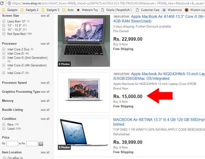 ਈ - ਕਾਮਰਸ ਵੈਬਸਾਈਟ ebay ਐਪਲ ਮੈਕਬੁਕ 'ਤੇ ਹੁਣ ਤੱਕ ਦਾ ਸਭ ਤੋਂ ਵੱਡਾ ਡਿਸਕਾਉਂਟ ਆਫਰ ਲੈ ਕੇ ਆਈਆ ਹੈ। ਇਹ 13 ਇੰਚ ਵਾਲੀ ਨਵੀਂ Apple MacBook Air ਨੂੰ ਸਿਰਫ 15,000 ਰੁਪਏ 'ਚ ਸੇਲ ਕਰ ਰਹੀ ਹੈ। ਇਸ ਮੈਕਬੁਕ ਦੀ ਕੀਮਤ 92,500 ਰੁਪਏ ਹੈ। ਇਸ ਆਫਰ ਨਾਲ ਯੂਜ਼ਰ ਨੂੰ 77,500 ਰੁਪਏ ਦਾ ਵੱਡਾ ਲਾਭ ਹੋਵੇਗਾ। ਇਹ ਆਫਰ 25 ਮਾਰਚ, 2018 ਤਕ ਵੈਲਿਡ ਹੈ।