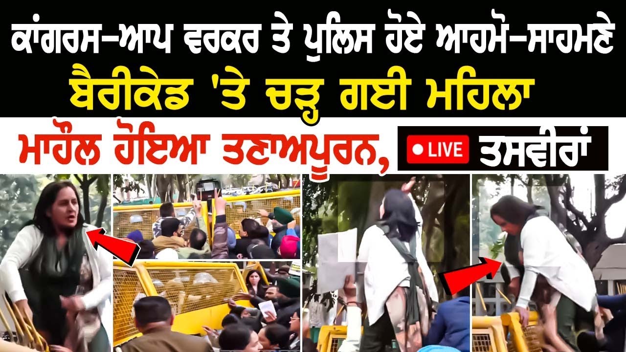 Congress - AAP Worrker ਤੇ Police ਹੋਏ ਆਹਮੋ-ਸਾਹਮਣੇ, Barricade 'ਤੇ ਚੜ੍ਹ ਗਈ ਮਹਿਲਾ, ਮਾਹੌਲ ਹੋਇਆ ਤਣਾਅਪੂਰਨ